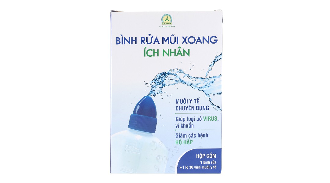 Bình rửa mũi xoang Ích Nhân đi kèm với muối y tế dùng để pha dung dịch natri clorid 0,9% giúp vệ sinh họng, khoang miệng hàng ngày.
