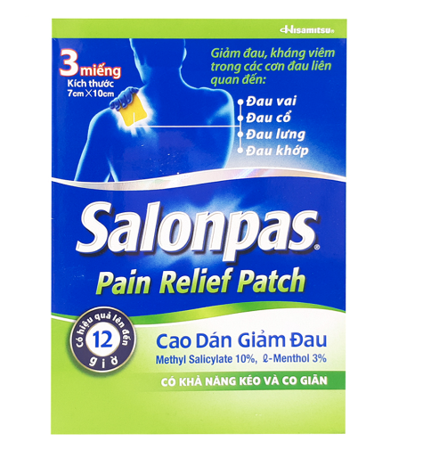 Cao dán giảm đau Salonpas Pain Relief Patch Hishamisu là sản phẩm Dược phẩm Hisamitsu Việt Nam sản xuất, thành phần chính là Methyl salicylate và 9 -Menthol, dùng để giảm đau, kháng viêm trong đau cổ, đau vai, đau khớp, viêm khớp, đau lưng, căng cơ, bầm tím, bong gân.