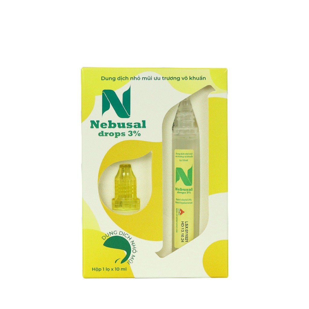 Dung dịch nhỏ mũi Nebusal drops 3% là dung dịch nước muối ưu trương, vô trùng có tác dụng làm ẩm và làm sạch khoang mũi, loại bỏ các chất nhày, bụi bẩn, các chất gây dị ứng và các tác nhân gây nhiễm khuẩn, giúp giảm sung huyết mũi, mang lại cảm giác thoải mái. Sản phẩm được bổ sung Natri Hyaluronat, một thành phần tự nhiên có trong cơ thể, giúp làm ẩm mũi, đồng thời tạo lớp màng nhầy giúp nhanh chóng phục hồi về trạng thái sinh lý bình thường của mũi.