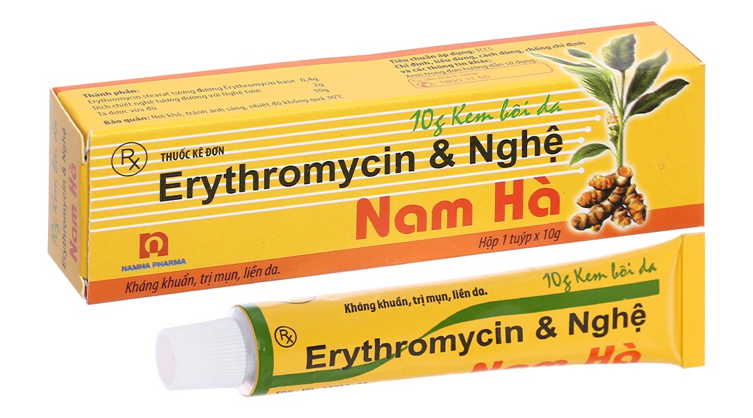 Erythromycin Nghệ 10g của công ty Cổ Phần Dược Phẩm Nam Hà, thành phần chính erythromycin stearat và dịch chiết nghệ tươi, là thuốc dùng để điều trị mụn nhọt, trứng cá đặc biệt là dạng mưng đỏ có mủ, ngoài ra còn dùng điều trị vết thương, vết bỏng đang lên da non.