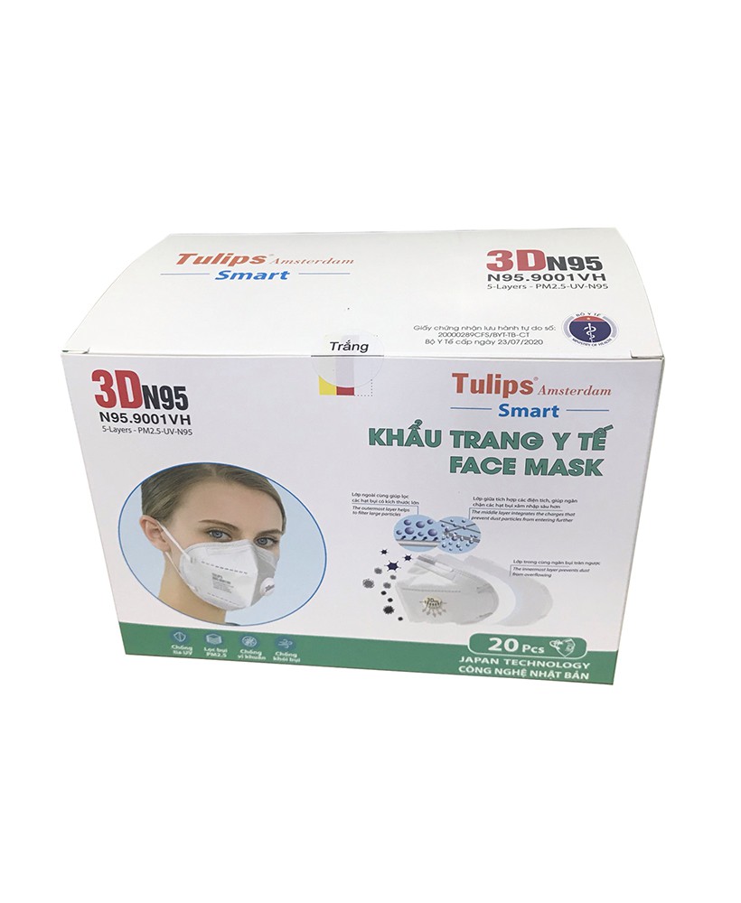 • Khẩu trang Tulips 3D N95 không van thiết kế thông minh, sử dụng màng lọc Micro Filter. N95 theo công nghệ Nhật Bản có tác dụng lọc không khí ô nhiễm, chặn 99% vi khuẩn, virus, lọc trên 95% bụi PM2.5 nguy hiểm…