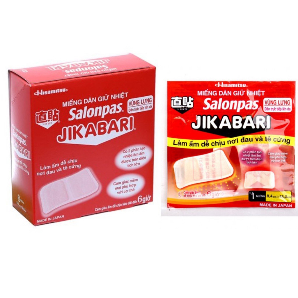 Miếng dán giữ nhiệt Salonpas JIKABARI là sản phẩm y tế dùng ngoài da do công ty Hisamitsu Nhật Bản sản xuất. Sản phẩm sinh nhiệt thông qua phản ứng của sắt với oxy trong không khí cùng chất xúc tác từ muối giúp làm ấm cơ thể, mang đến cảm giác ấm nóng dễ chịu ở nơi bị đau và tê cứng đến khoảng 40 độ C và kéo dài suốt 6 giờ.