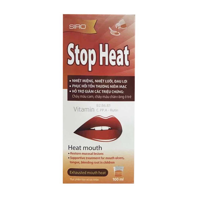 - Siro Stop Heat là sản phẩm dùng cho các trường hợp nhiệt miệng, nhiệt lưỡi, đau lợi, phục hồi tổn thương niêm mạc. Siro Stop Heat cung cấp các loại vitamin hỗ trợ tăng sức đề kháng, giảm chảy máu cam, chảy máu chân răng ở trẻ