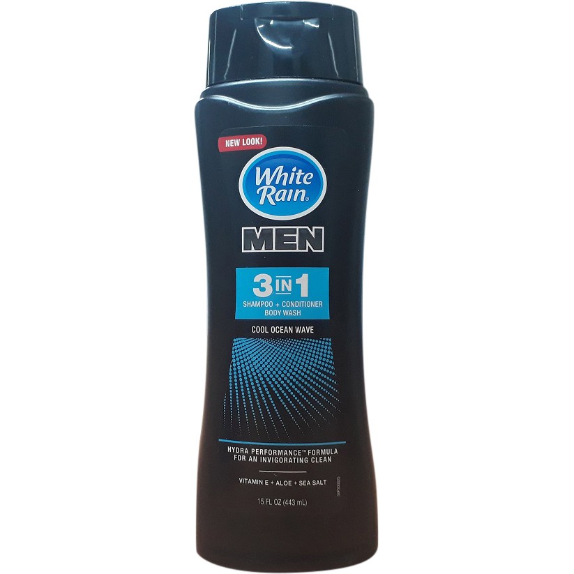 Sữa tắm gội cho nam White Rain 3-in-1 Cool Ocean Wave với thành phần chứa Vitamin E và tinh chất lô hội giúp nuôi dưỡng, cấp ẩm cho da. Sản phẩm giúp làm sạch da cơ thể và da đầu tối ưu. Một điểm đặc biệt của sản phẩm là có khả năng vừa gội vừa xả cho tóc cho thấy thành phần vô cùng nhiều dưỡng chất trong một chai sản phẩm.