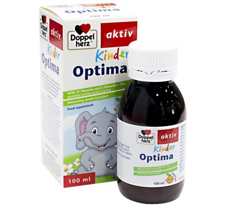 Doppelherz Kinder Optima với công thức độc đáo chứa l-lysine cùng 17 dưỡng chất thiết yếu giúp hỗ trợ tác động toàn diện lên các hệ thống, cơ quan của cơ thể trẻ. Sản phẩm được kiểm nghiệm bởi tiêu chuẩn khắt khe của Châu Âu, đạt chuẩn quy định GMP, không chứa hormone tăng trưởng, không chứa corticoid, không gây trữ nước hay tăng cân ảo. Đặc biệt đây là sản phẩm duy nhất có bổ sung thành phần hỗ trợ chức năng tạo máu: sắt, iot, axit folic, mangan. Siro có vị cam thơm ngon, dễ uống, giúp con thích thú khi sử dụng mỗi ngày.