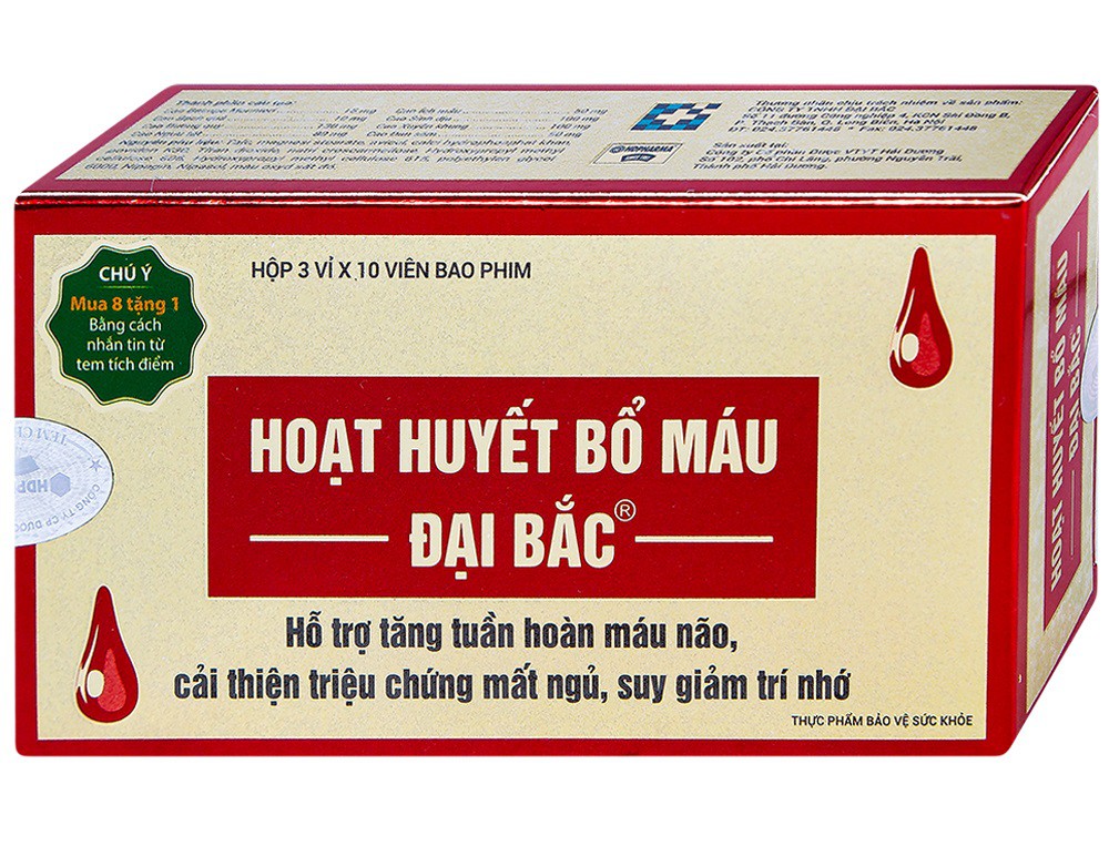 Viên uống Hoạt Huyết Bổ Máu Đại Bắc giúp bổ huyết, hỗ trợ tăng cường lưu thông máu, giúp cải thiện tuần hoàn máu não, hỗ trợ giảm các triệu chứng: Đau đầu, hoa mắt, chóng mặt, suy giảm trí nhớ, tê bì, nhức mỏi chân tay, khó ngủ do lưu thông máu kém.