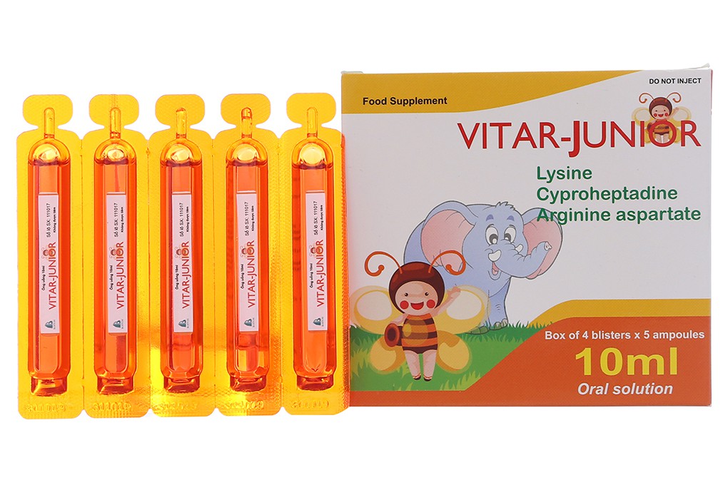 Dung dịch uống VITAR-JUNIOR là kết hợp giữa arginin aspartat, lysin hydroclorid, Vitamin B1, Vitamin B6.