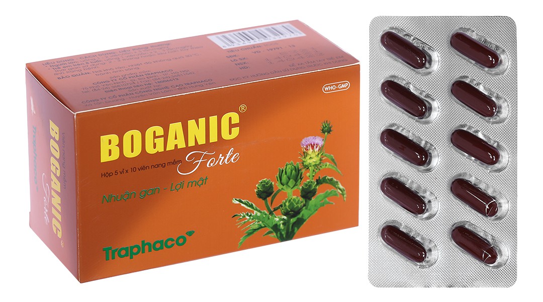 Thuốc Boganic Forte của Công ty Cổ phần Công Nghệ Cao Traphaco, với hoạt chất chính là Cao Actisô, Cao Rau đắng đất, Cao Bìm bìm. Đây là thuốc được dùng điều trị trong suy giảm chức năng gan, đặc biệt do dùng nhiều bia, rượu, phòng và hỗ trợ điều trị viêm gan do thuốc, hóa chất, viêm gan gây mệt mỏi, khó tiêu, vàng da, bí đại tiểu tiện, táo bón. Ngoài ra, thuốc còn được dùng trong trường hợp dị ứng, mụn nhọt, lở ngứa, nổi mề đay do gan gây ra và vữa xơ động mạch, mỡ trong máu cao.
