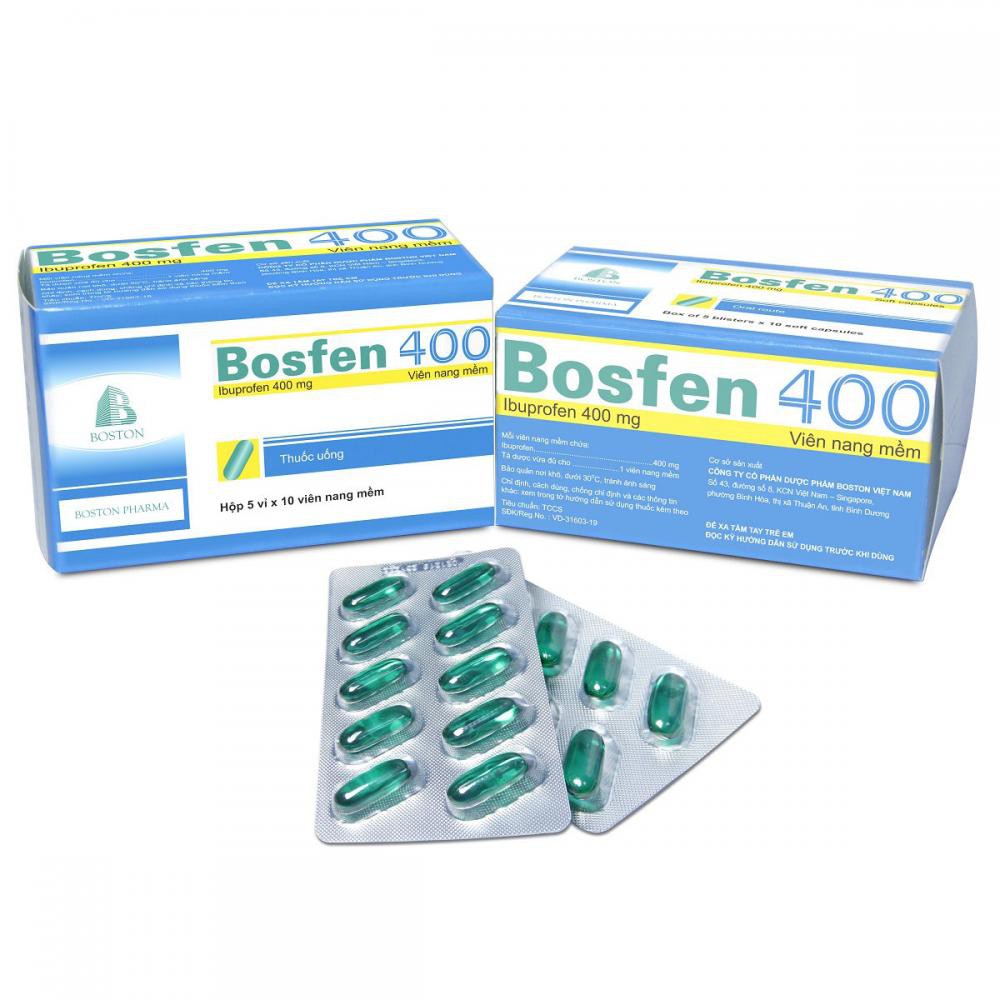 Thuốc Bosfen 400 được sản xuất bởi Công ty Cổ phần dược phẩm Boston (Việt Nam), có hoạt chất chính là Ibuprofen 400mg. Thuốc Bosfen 400mg liều thấp được dùng trong điều trị các triệu chứng đau thường gặp như đau đầu, đau răng, đau bụng kinh, đau cơ, và hạ sốt nhẹ đến trung bình. Bosfen 400 liều cao được dùng trong điều trị dài hạn bệnh xương khớp mạn tính như: viêm đa khớp dạng thấp, viêm cột sống dính khớp, viêm khớp vẩy nến, khớp đau và bất động, hội chứng Friessinger-Leroy-Reiter. Ngoài ra, Bosfen 400 liều cao còn được dùng ngắn hạn trong điều trị đợt cấp của các bệnh như:viêm quanh khớp vùng vai cánh tay, viêm gân, viêm túi thanh mạc, đau thắt lưng, viêm rễ dây thần kinh.