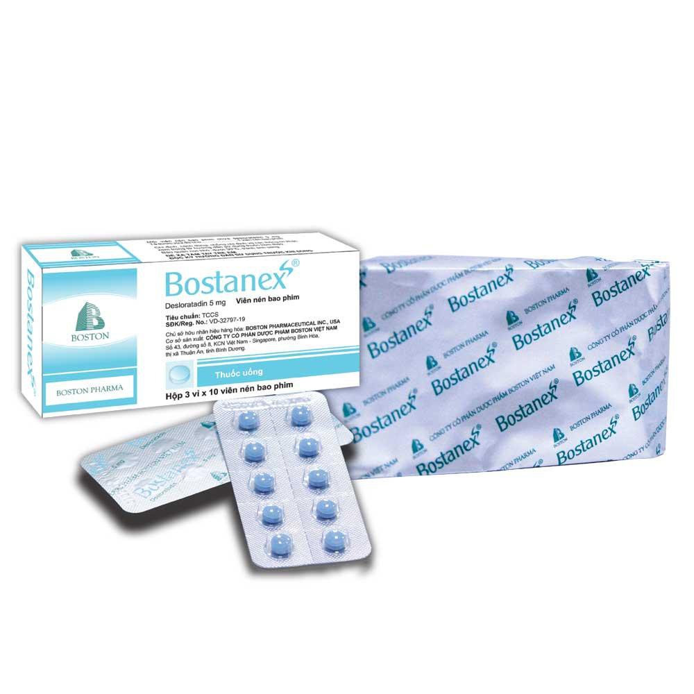 Bostanex là sản phẩm của Boston Pharma, với thành phần chính là Desloratadin. Đây là thuốc được chỉ định để giảm các triệu chứng liên quan đến viêm mũi dị ứng như hắt hơi, sổ mũi và ngứa mũi, cũng như ngứa, chảy nước mắt và đỏ mắt, ngứa họng và ho. Giảm các triệu chứng liên quan đến mày đay như giảm ngứa, giảm kích cỡ và số lượng ban.