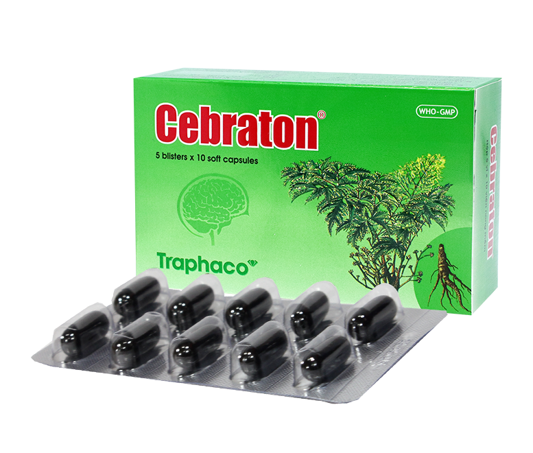 Cebraton được sản xuất bởi Công ty cổ phần Traphaco là thuốc bổ thần kinh được bào chế từ 100% dược liệu nguồn gốc thảo mộc với sự tiếp thu kết quả nghiên cứu đầy đủ của các thầy thuốc Pháp và Việt Nam, với thành phần chính là cao đặc rễ đinh lăng và cao khô lá bạch quả. Với công dụng: