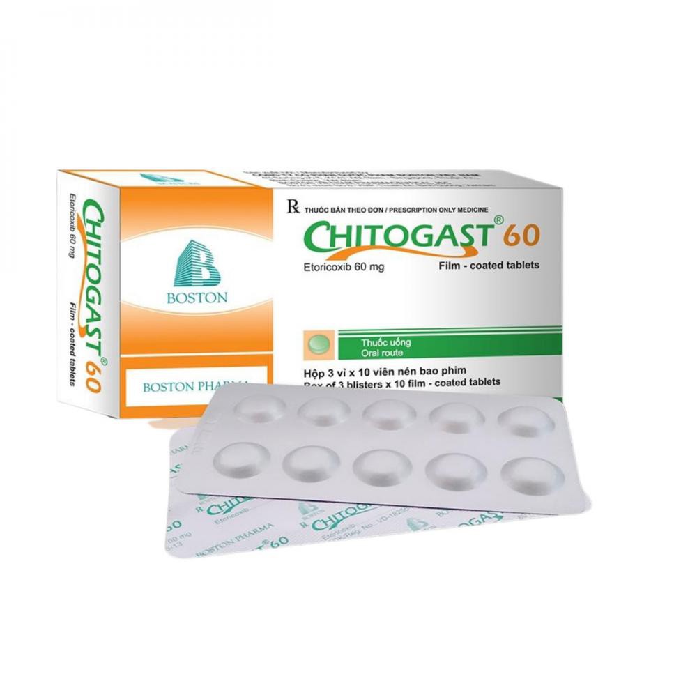 Chitogast 60mg được sản xuất bởi công ty cổ phần dược phẩm Boston Việt Nam, thành phần chính là etoricoxib, là thuốc được dùng trong điều trị triệu chứng các bệnh viêm xương khớp cấp và mạn tính; điều trị viêm đốt sống dạng thấp; điều trị viêm khớp thống phong cấp tính (gút cấp tính); điều trị triệu chứng đau bụng kinh nguyên phát, giảm đau cấp và mạn tính.