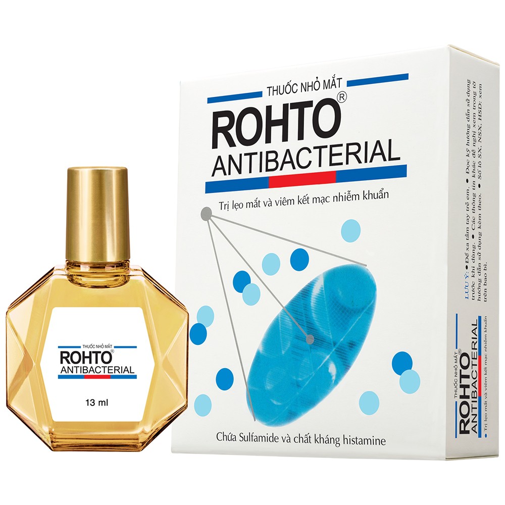 - Rohto Antibacterial thuộc nhóm thuốc dùng điều trị mắt, tai mũi họng. Thuốc được bào chế dưới dạng dung dịch nhỏ mắt và đóng theo hộp 1 lọ 10ml và 13 ml.