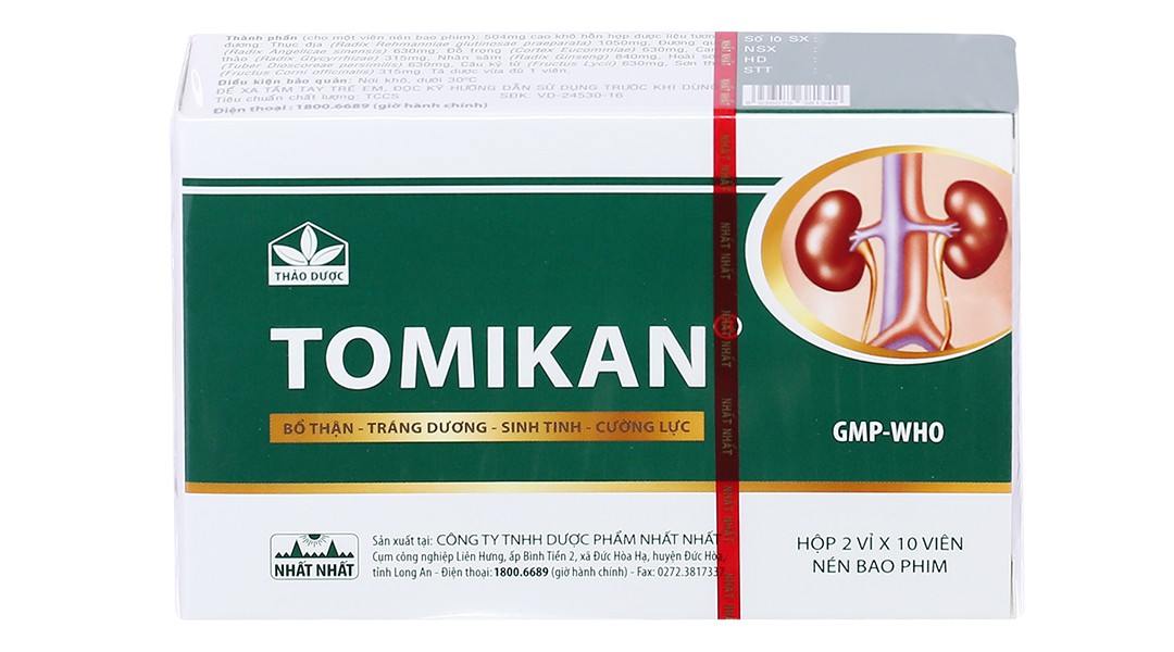 Thuốc TOMIKAN của Công ty TNHH Dược phẩm Nhất Nhất, chứa hoạt chất chính được chiết xuất từ các loại thảo dược như Thục địa, Đương quy, Đỗ trọng, Cam thảo, Hoài sơn, Câu kỷ tử, Sơn thù.