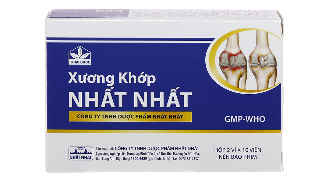 Xương Khớp Nhất Nhất của công ty TNHH Dược phẩm Nhất Nhất, thành phần chính đương quy, đỗ trọng, cẩu tích, đan sâm, liên nhục, tục đoạn, thiên ma, cốt toái bổ, độc hoạt, sinh địa, uy linh tiên, thông thảo, khương hoạt, hà thủ ô đỏ.Đây là thuốc dùng để điều trị các chứng đau lưng, đau thần kinh tọa, các chứng phong tê thấp, hỗ trợ điều trị thoái hóa, vôi hóa, gai cột sống, hỗ trợ phòng ngừa bệnh tái phát.